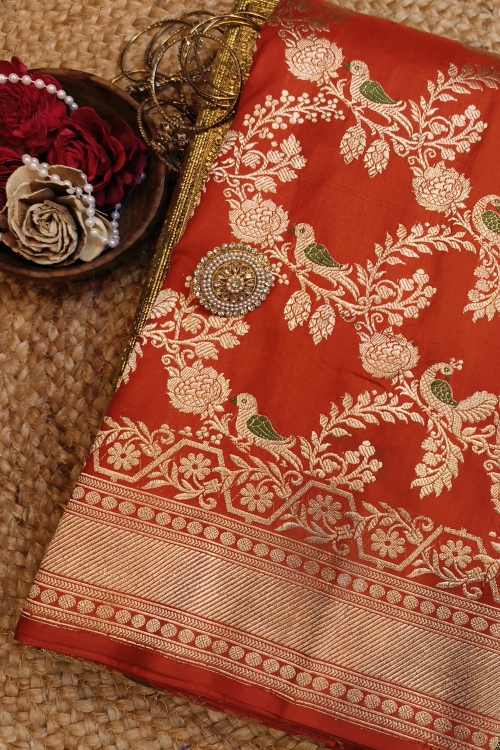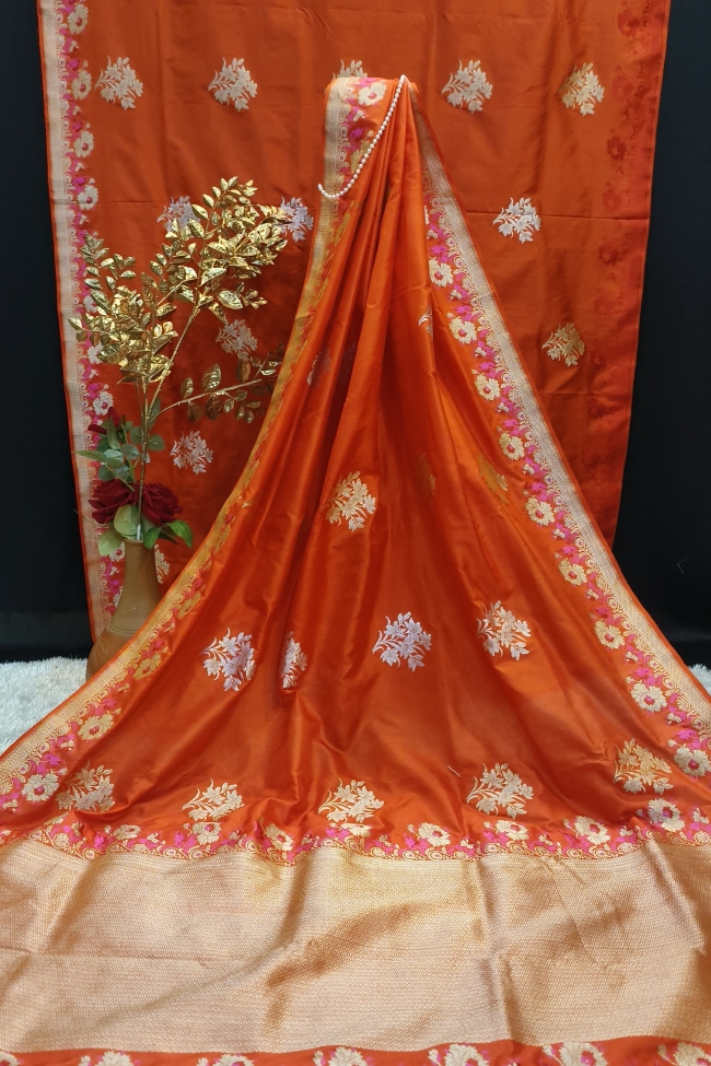 Handwoven Orange Meenedar Jangla Banarasi Silk Saree