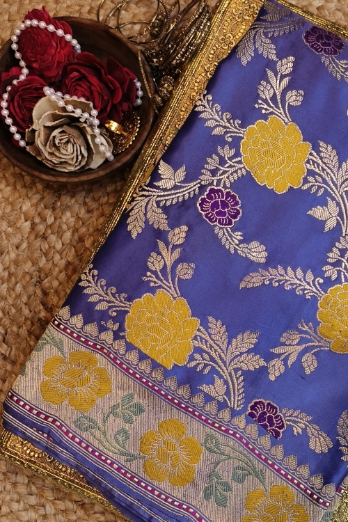 Handwoven Blue Satin Meenadar Jangla Banarasi Silk Saree