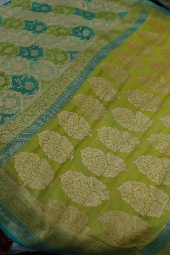 Speciality – A dyeable Green-Blue Georgette Banarasi Saree featuring a delicate floral jaal and heavy floral pallu, offering both versatility and traditional charm. .