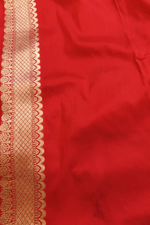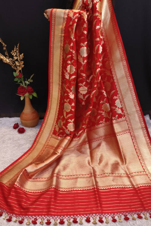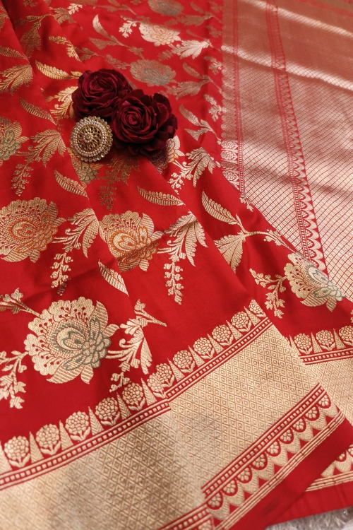 This Red Handwoven Banarasi Katan Silk Saree is a true representation of age-old weaving traditions. Featuring an intricate Meenedar Jangla design across the body with golden zari and meena in floral patterns, this saree exudes sophistication. Its luxurious fabric and beautiful red blouse piece make it ideal for grand celebrations.