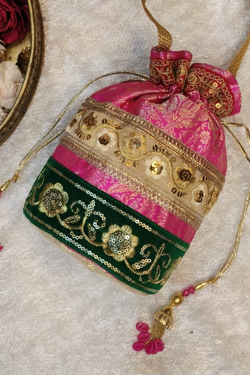 • Speciality –The pink-green Banarasi silk potli features a luxurious double layer of rich laces, crafted from premium silk fabric with elegant tassels. Its intricate design makes it a perfect accessory for festive occasions and traditional attire.