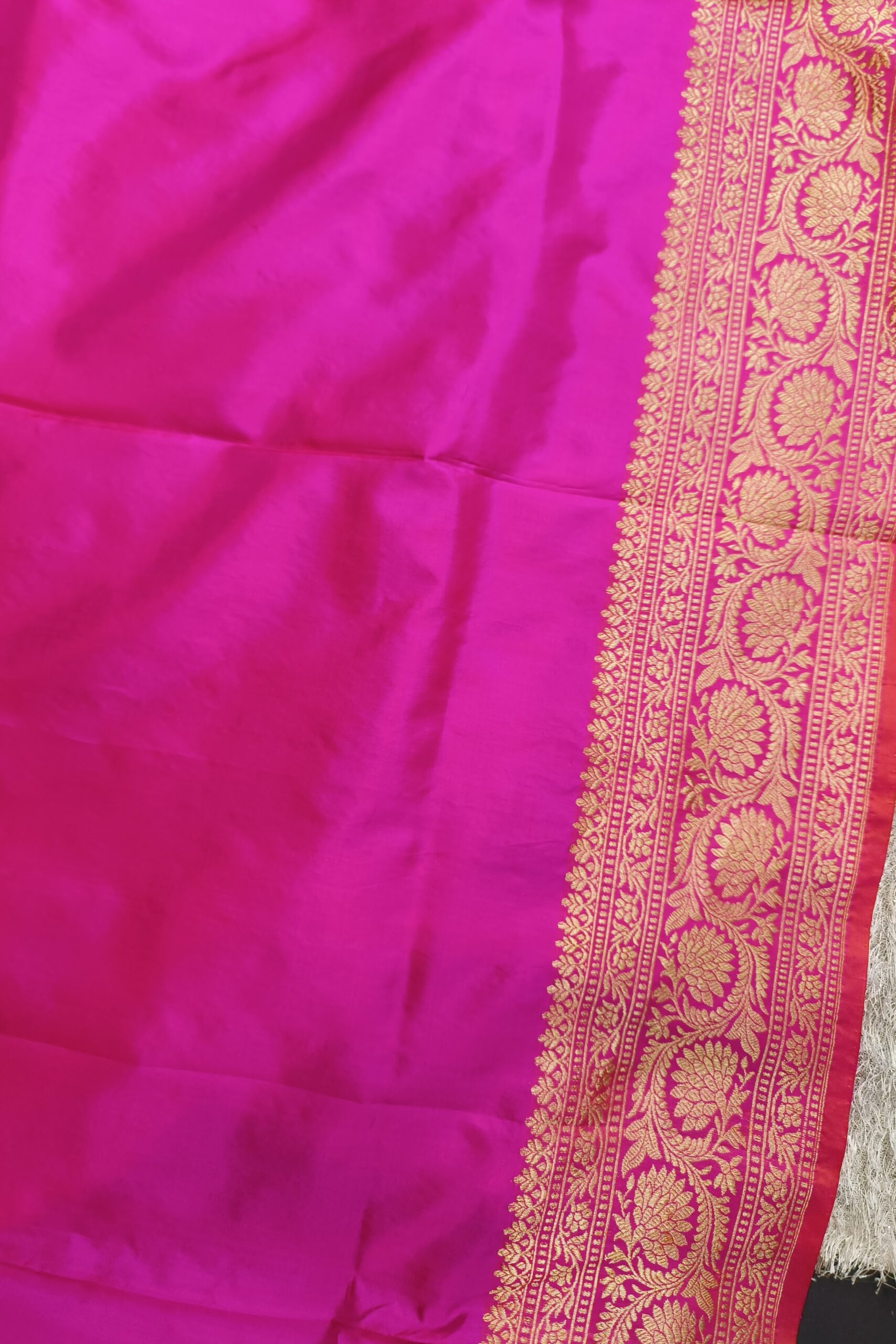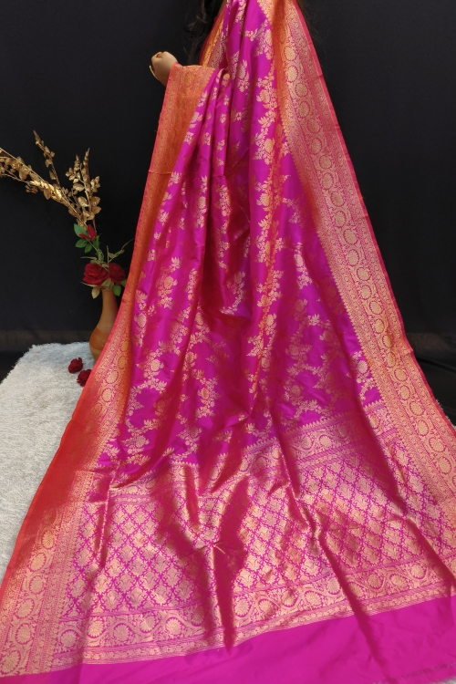 - Speciality –This Handwoven Pink Kadiyal Jangla Banarasi Silk Saree is a masterpiece of intricate craftsmanship, featuring a rich golden zari weave. The kadiyal technique seamlessly merges vibrant borders with the luxurious jangla design, creating a stunning contrast and unique texture.